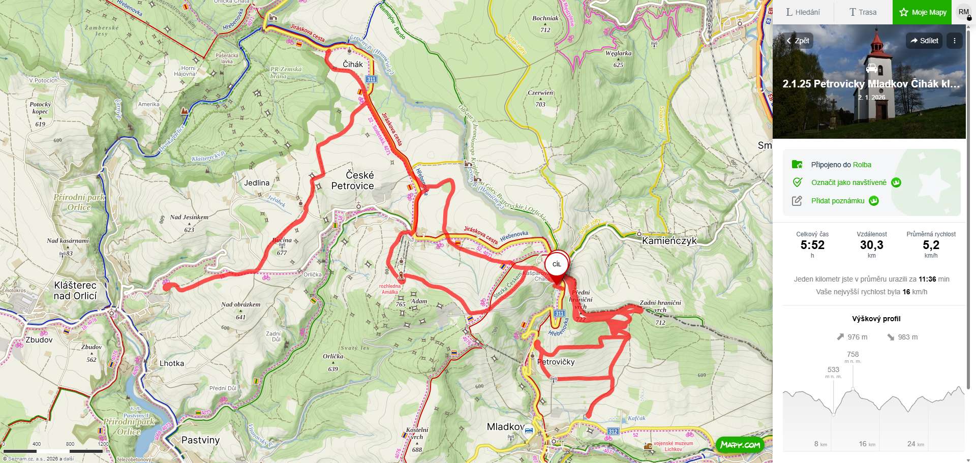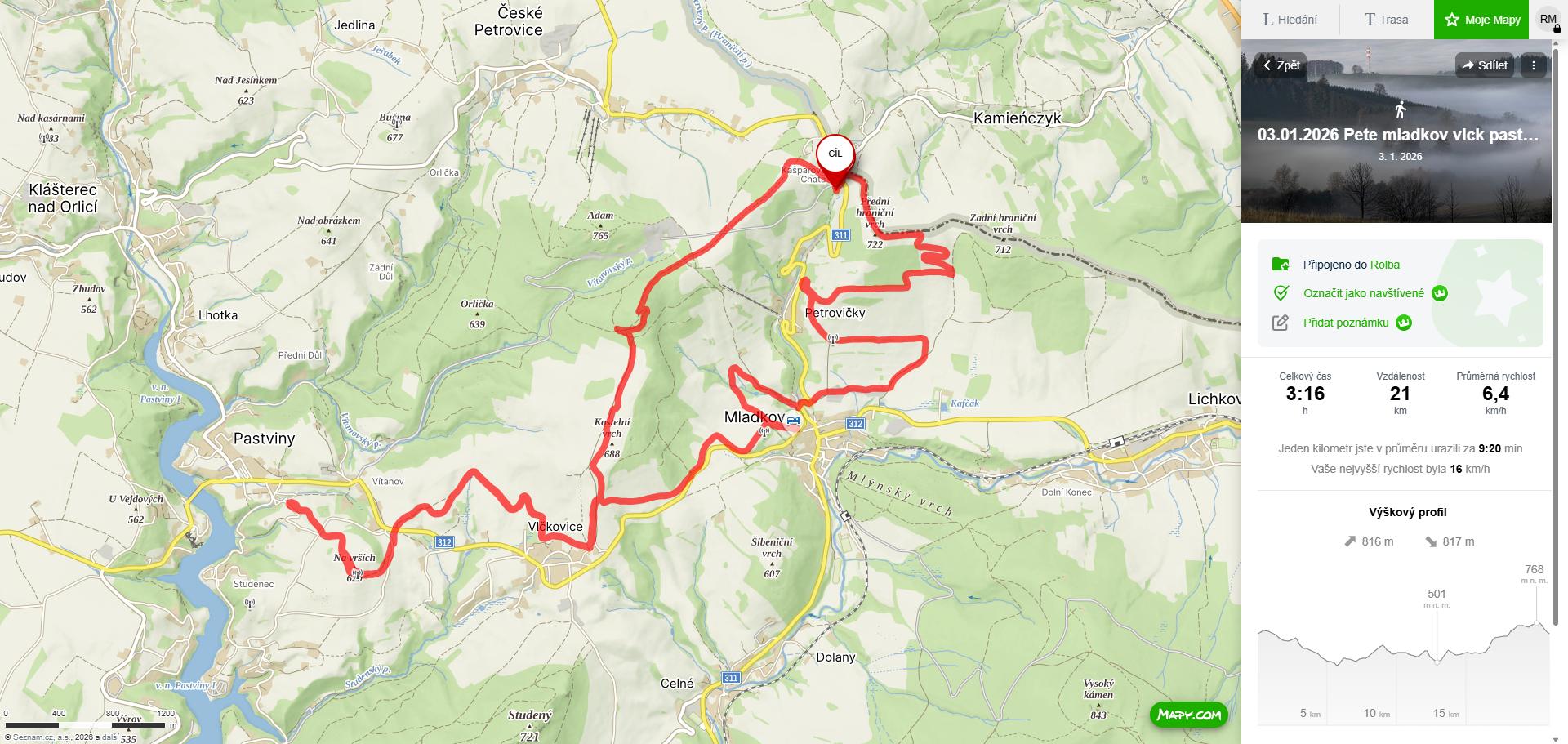 10.1.26: projeta celá trasa Přední hraniční vrch ke kostelu a transformátoru v Petrovičkách a dále k zemědělskému družstvu v Mladkově - přes odbočku z Mladkova na Petrovičky - Vlčkovice - Pastviny a při návratu z Vlčkovic klasicky lesem přes Adam na Kašparku. Dále trasa Kašparka - Č.Petrovice - Čihák - Klášterec.