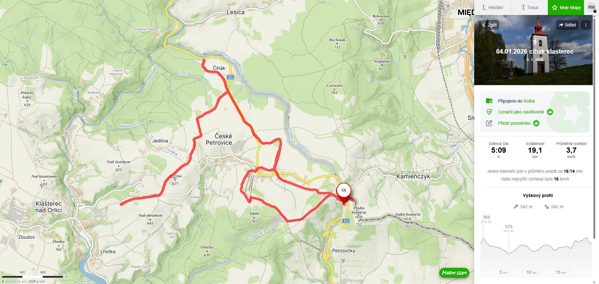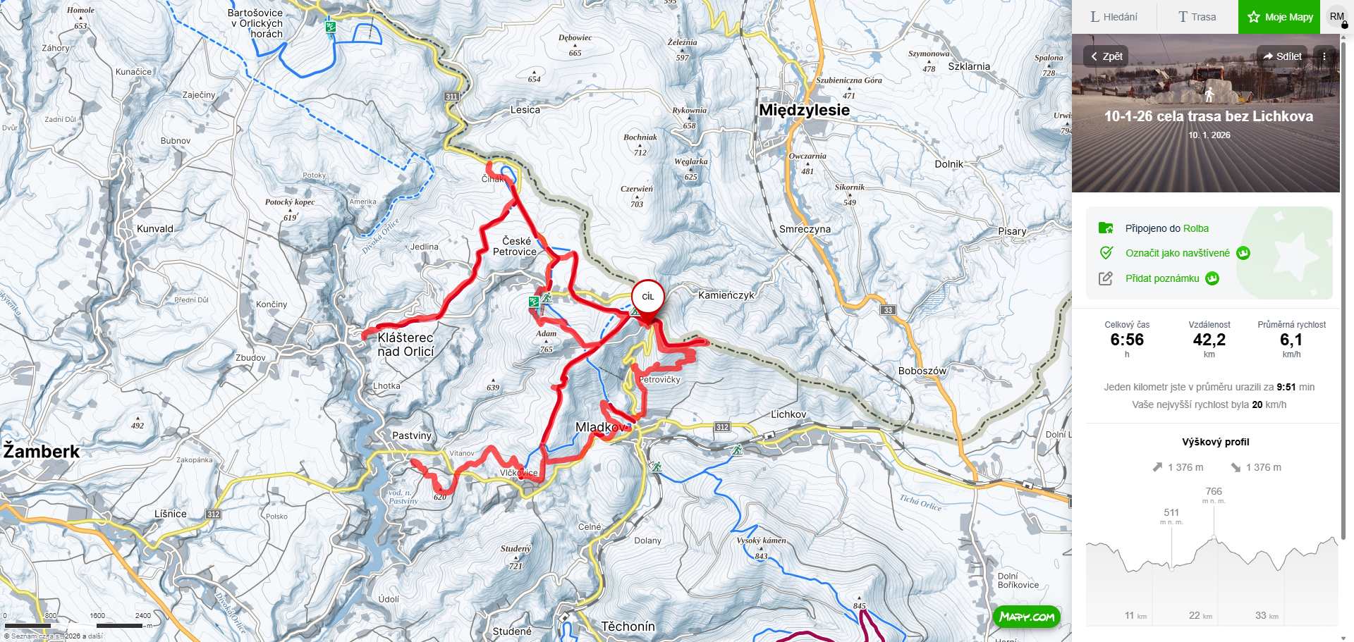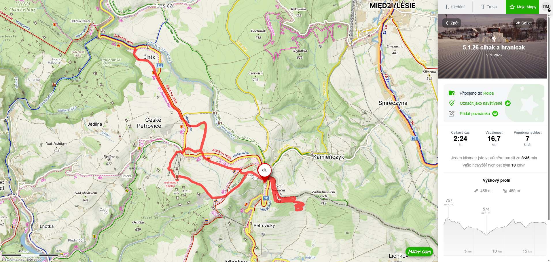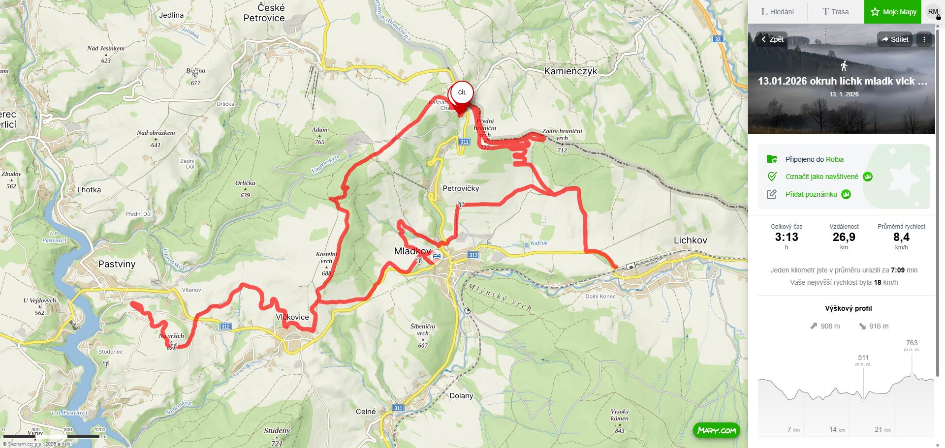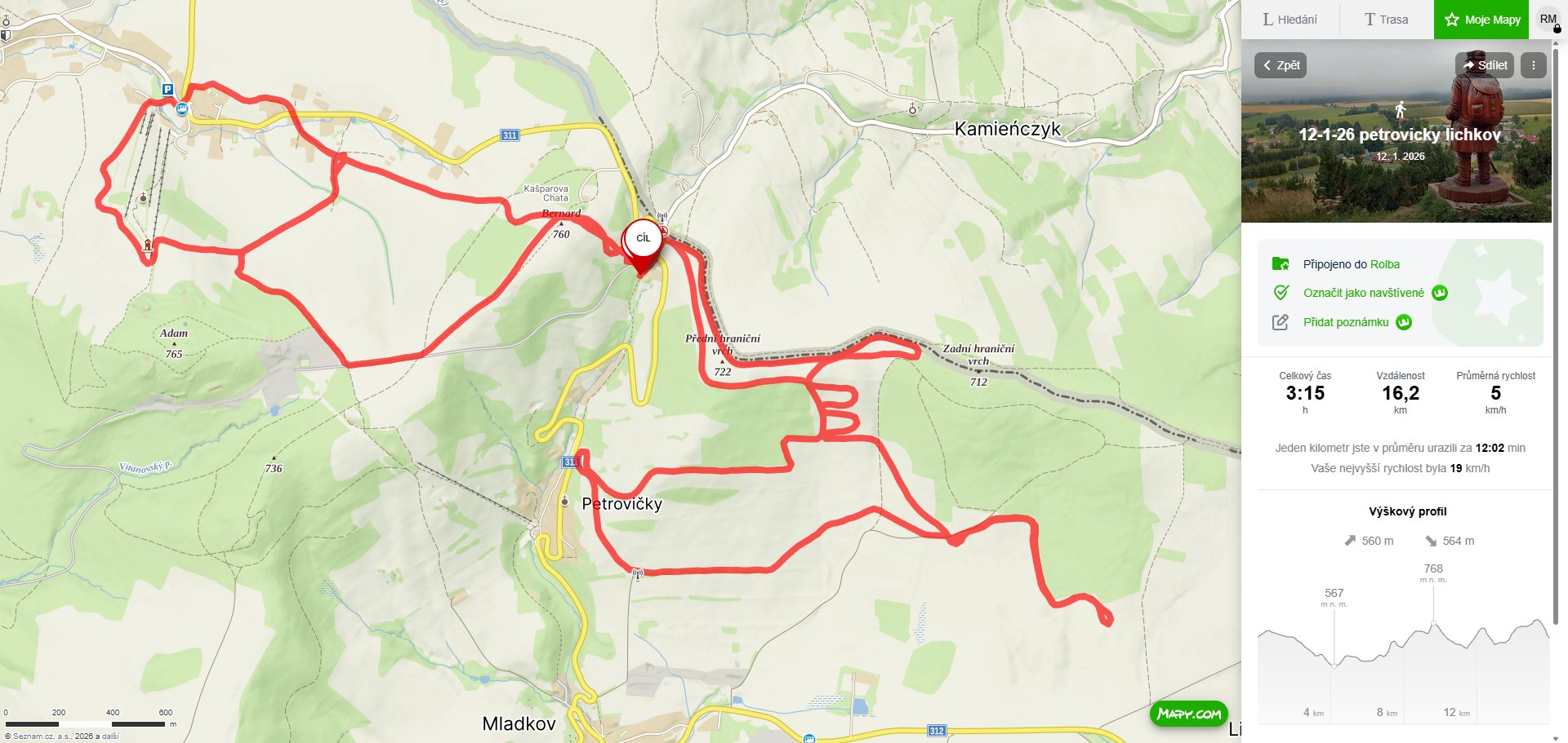 12-1-26: upravena trasa Přední hraniční vrch ke kostelu a transformátoru v Petrovičkách a směr k železničnímu nádraží v Lichkově - až tam jsem nedojel kvůli nedostatku sněhu na poli. Dále malý okruh Kašparka - Č.Petrovice - Amálka - vojenský prostor - Kašparka.